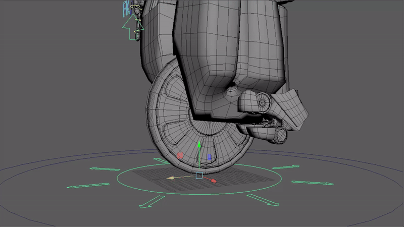Kla-Ra's wheel automatically rotates when the wheel control is moved forward, allowing for easy animation. It also comes with a manual rotation, an 'in-air' controller that stops rotation for shots where the wheel is off the ground, and a multiplier for the automatic rotation so that the speed can be fine-tuned to match perfectly.